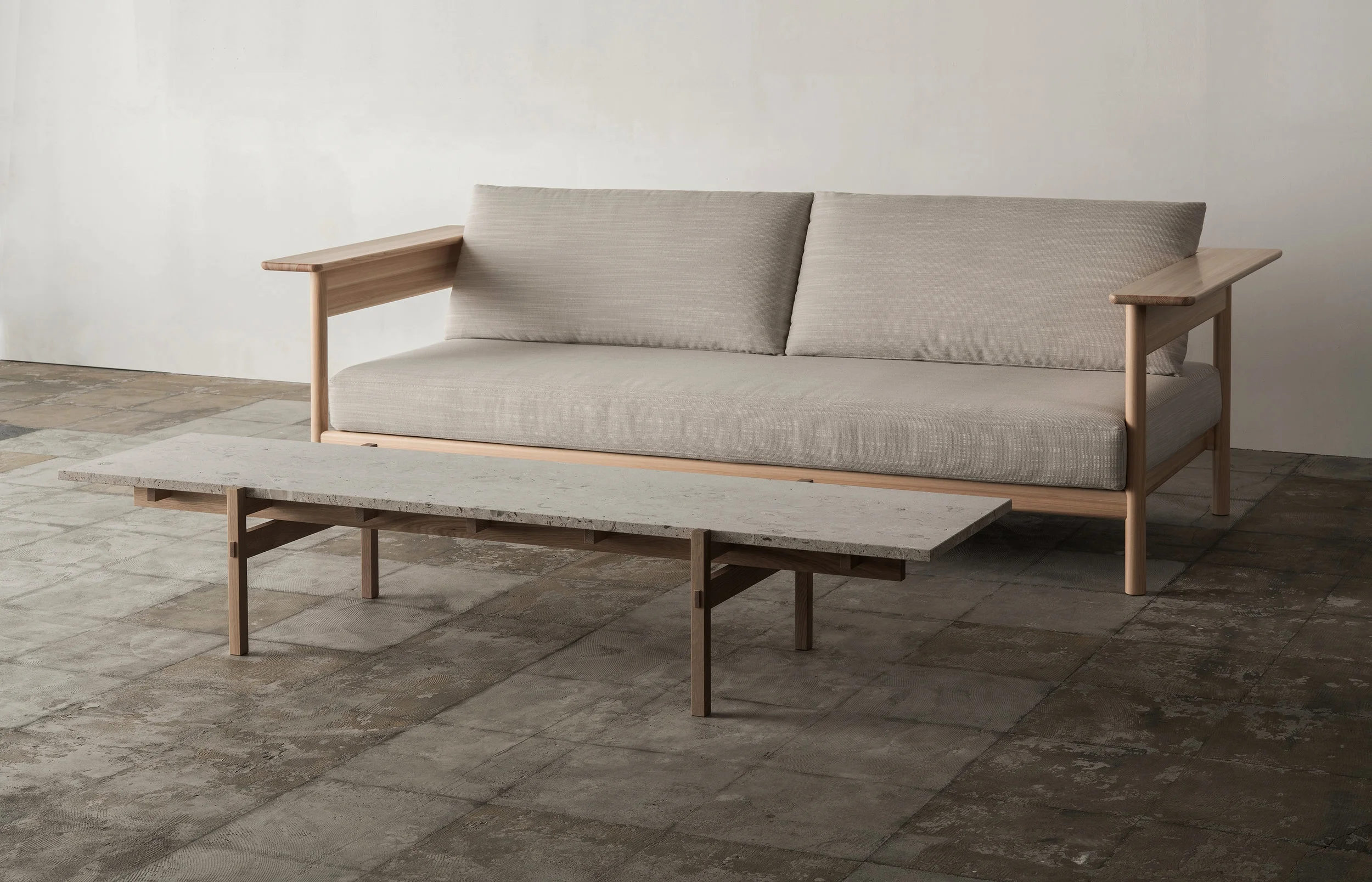 “The Hinoki wood sofa boasts clear references to traditional Japanese architecture methods as well as democratic Danish furniture from the 50’s. All elements are on display, with the armrest continuing along the backrest of the sofa and thereby creating a shelf-like element, increasing functionality and making it suitable for a small home.