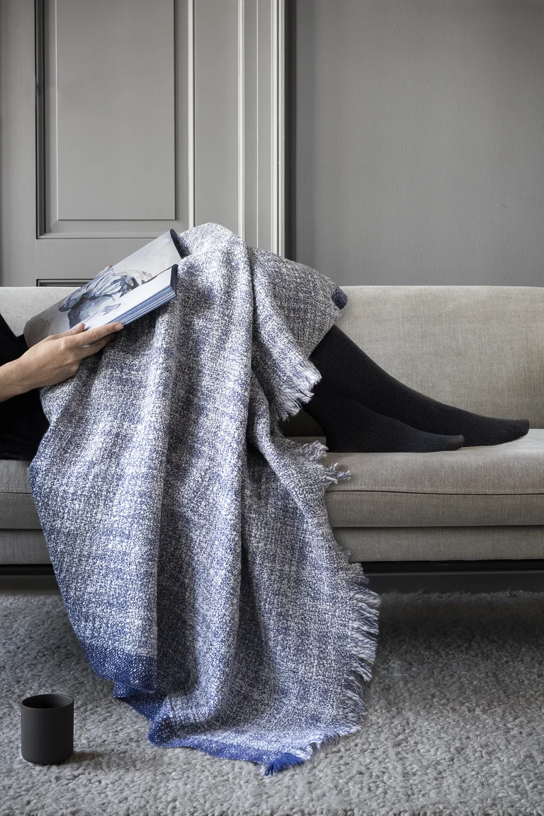 We love this beautiful warm and soft blanket made of 100 % quality wool melange in a calming blue colour. It's woven of a white and a blue thread, creating a lovely pattern, adorned by loose fringes at both ends and it is for such a good cause!