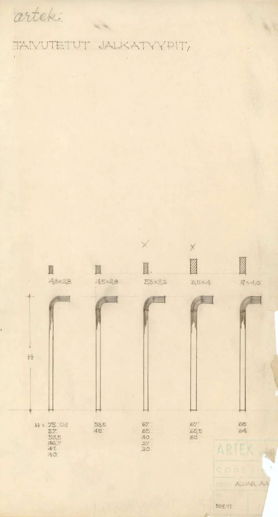 In the late 1920s, Aalto collaborated with the furniture manufacturer Otto Korhonen on a number of innovative techniques. This led to the development of the L-leg, an L-shaped leg composed of solid bent wood that enabled the creation of more than 50 different products.