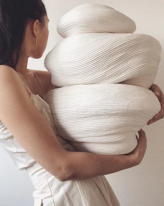 Rose Wei works under the pseudonym Zhu Ohmu and created these ceramic vessels called Coil pots. The initial concept for the pieces was a response to the rise in popularity of 3D printed ceramics. Corresponding to biomimetics - the imitation of models or systems of nature - she wanted to see what forms would manifest if she mimicked the 3D printer, mounding coils on top of each by hand.