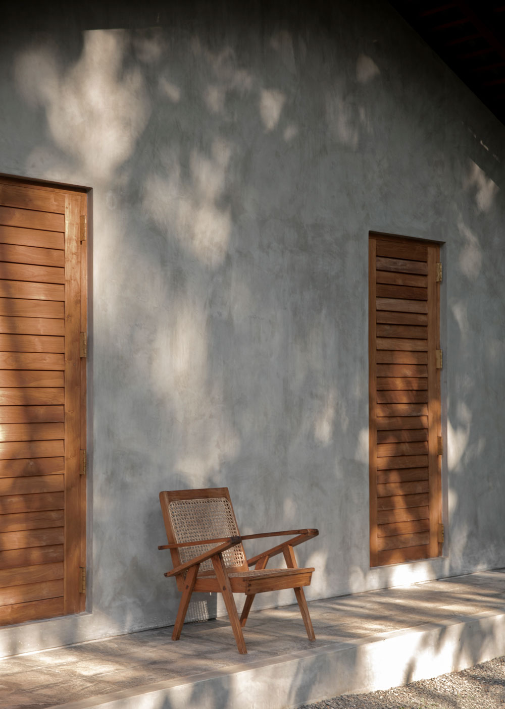 The architecture is composed of natural materials; local teak wood, polished terrazzo, facades of polished cement and outdoor areas of local granite stone. The roof is made of recycled terracotta tiles which complements the overall natural look and tactile feel of the house “