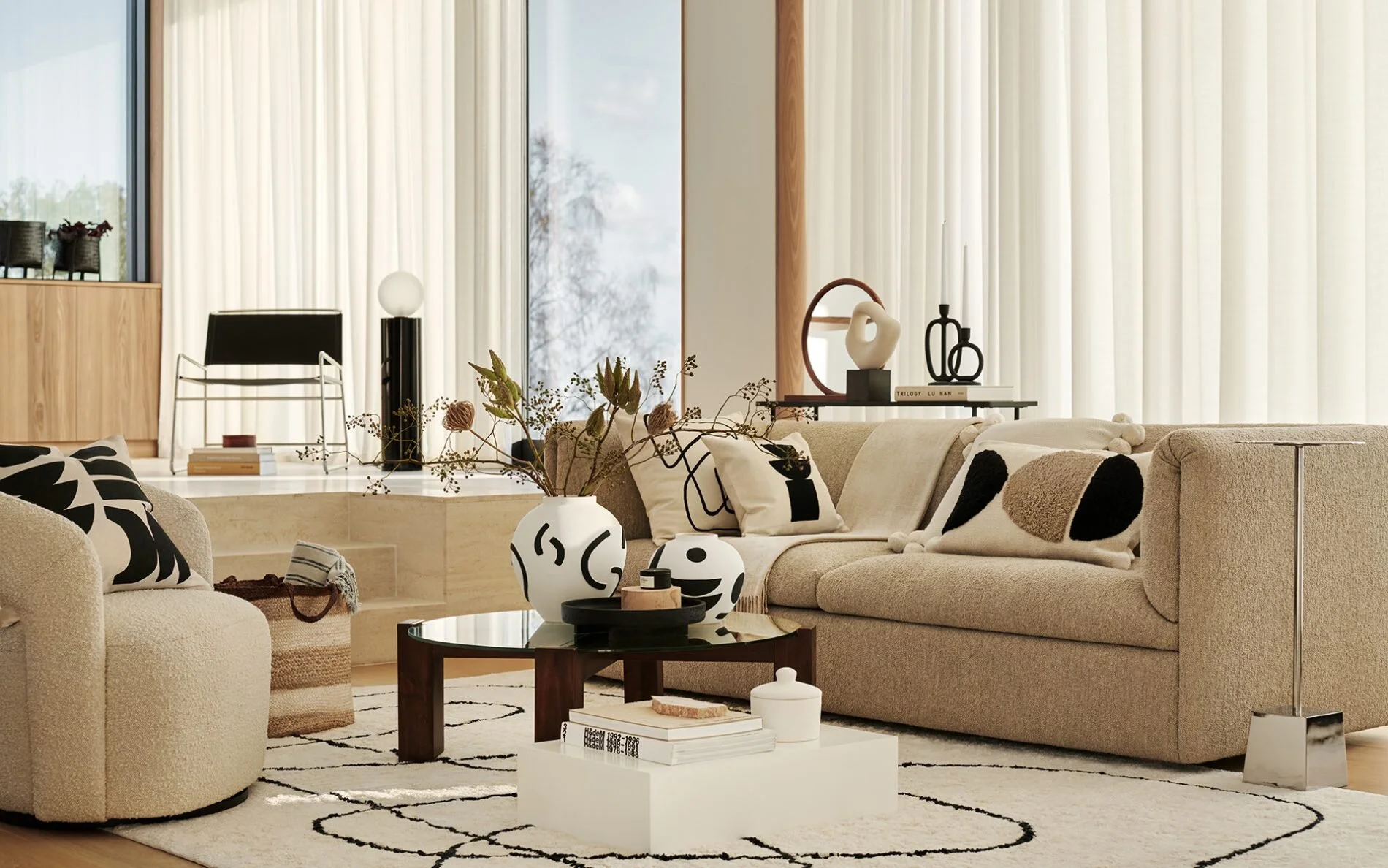 For this new season, H&M Home has used a neutral colour palette of creamy whites, beige, and black, taking inspiration from modern and artistic homes. Clean lines, bold prints and sculptures and sculptural and soft shapes are central in this trend . I was really inspired again by the stylish press images of this campaign led by creative director Therese Sennerholt.