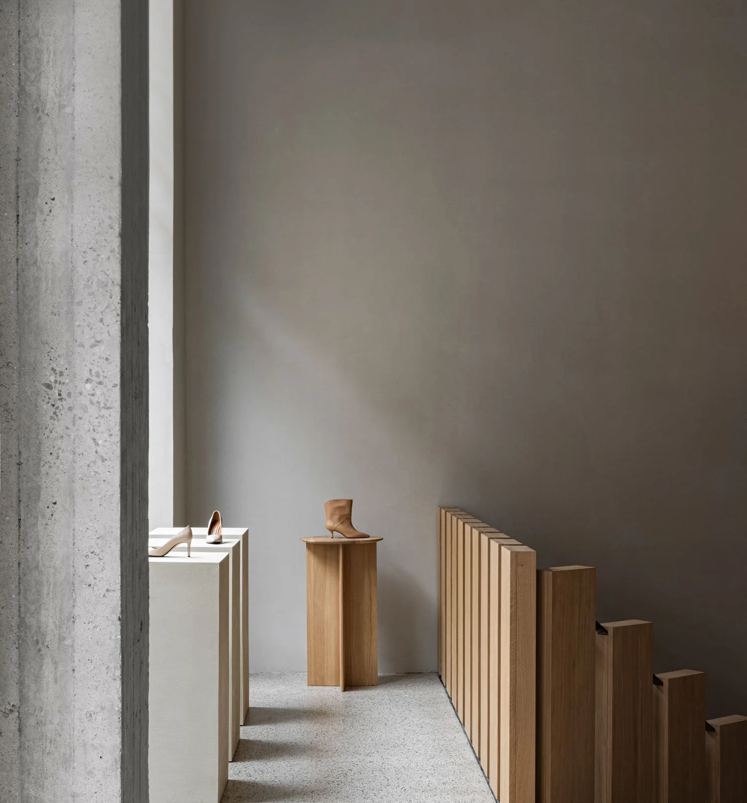 In the new flagship store for high-end shoe brand Notabene, vertical lines are repeated within the structure of a wooden staircase, free-standing concrete plinths and in soft folding curtains to create a harmonious and coherent space, leaving room for the fine handmade shoes to stand out and be the centre of attention. Connecting the different functions and levels of the space, the monumental staircase is not only an intriguing contrast to the softness of the bespoke furniture and the delicate shoes, but is also acting as a grand sculpture, adding a certain grandiosity to the architecture - Norm Architects