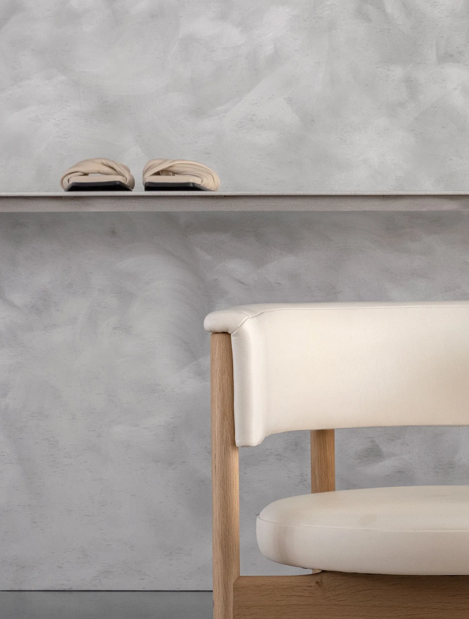 “Entering the store, one is welcomed by a grand double-height space with exposed and tactile concrete walls, an original terrazzo flooring, striking minimalist aluminium shelves and clay podiums, showcasing the newest collection of Italian handmade shoes as delicate icons. Norm Architects has completely redesigned the Notabene retail experience and created a hub where all things surrounding shoe design and shoe care are unified in a big industrial space comprising retail, shoeshine bar and creative lab. Carefully crafted by Japanese furniture brand Karimoku Case Study and local craftsmen alike, elegant furniture pieces accompany a monumental wooden staircase that sculpturally connects the three levels of the space, while playfully letting in the sunlight through its oak structure. The material combination of elegant wooden details, lush bouclé fabrics, hand brushed aluminium surfaces and rippled concrete creates an edgy universe that is both relaxed, refined, and luxurious at the same time”.