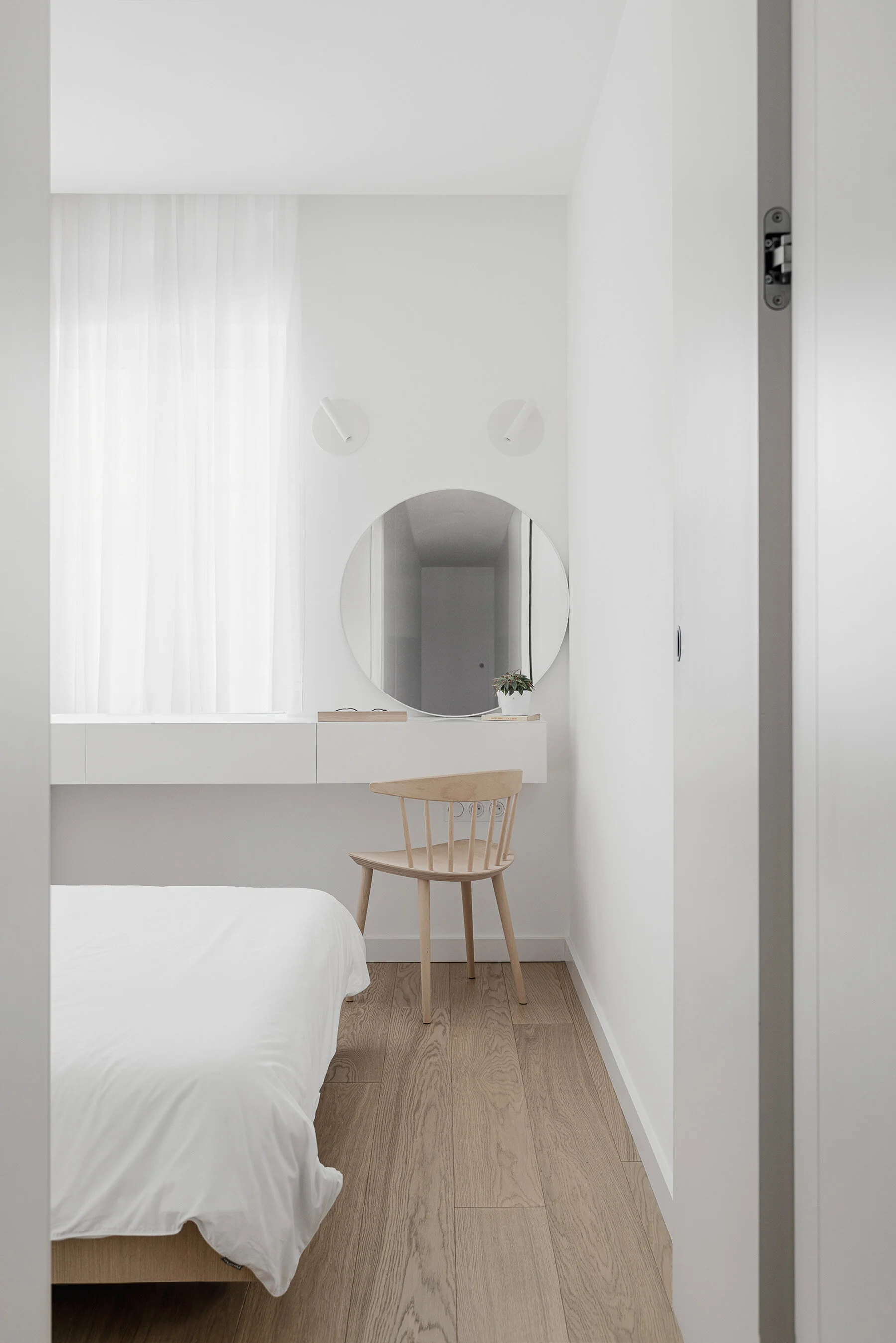 It was equally important to understand the relationship between the designed space and how it influences and interacts with the user's wellbeing. The scenography of the apartment was composed using an ascetic geometry carefully carved from a palette of natural materials such as wood, stone, ceramics, lime and marble plaster, locally softened with fabrics and upholstery. Visual accents of colour are introduced by the use of scattered natural vegetation, copper kitchen brassware accompanied by a deep tone of ironmongery. Alongside several furniture items of an original design, the apartment is dressed with some classic pieces such as J77 and J14 chairs from HAY, framing a bespoke solid wood dining table. The architectural character of the interior is additionally emphasised and enhanced by sunlight penetrating the space. A coherent composition based on a natural material palette forms a modest living environment, generously animated by the changing natural light. Complimentary lights are either discretely carved into the ceiling surface or become features of the space, such as native Chors or Scandinavian MENU lamps.”