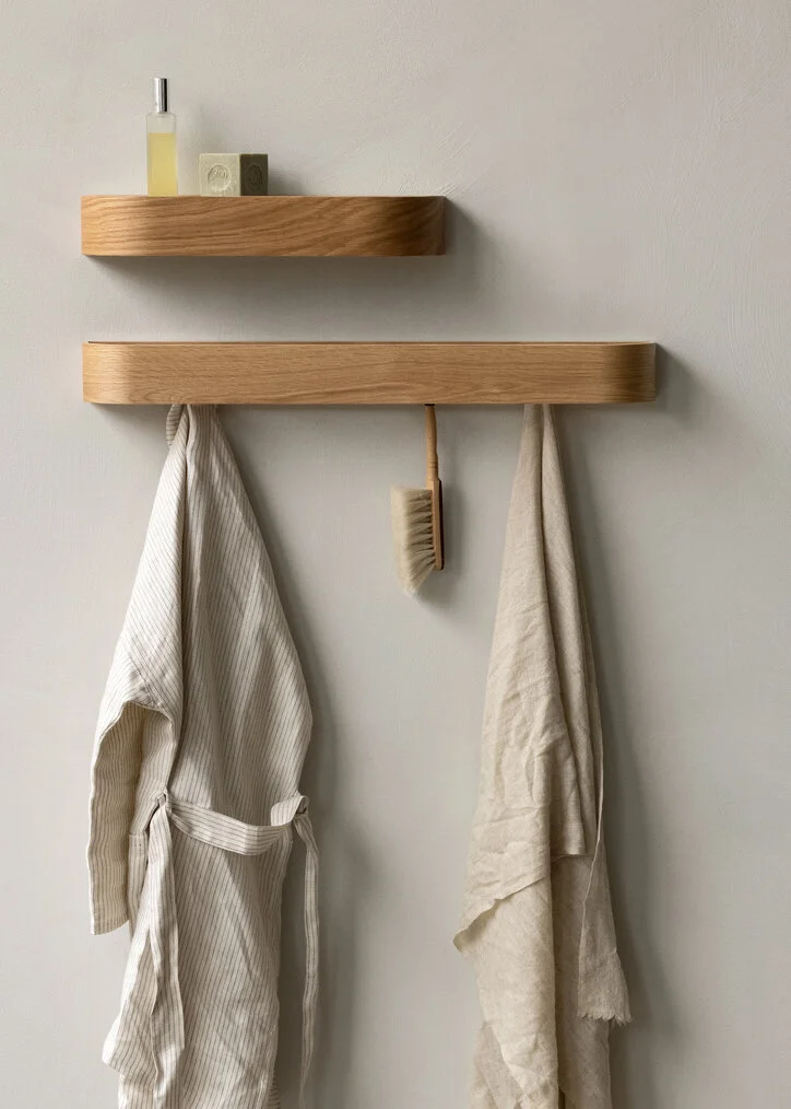 “Epoch Clothes Rack Clean lines, intuitive function and innate beauty define the Epoch Clothes Rack by Nina Bruun, one of two new designs from the Danish designer. Updating the ubiquitous coat rack and working from the idea of concealing unsightly hangers and tags behind something beautiful, the minimally elegant design profiles a considered combination of gently rounded edges, warm wood and discreet functionality. Developed and perfected over time, it is characterised by soft bands of undulating wood that sit like sculptures on a wall. Referencing 1950s design aesthetics and traditional craftsmanship, Epoch is pure in both form and material. Available in natural or dark stained oak, it is carefully sized to fit both purpose and place. Epoch Shelf One of two new designs that are coherent in design and carefully sized to fit both purpose and place, the Epoch Clothes Rack by Nina Bruun offers streamlined storage for spaces large and small. Improving and beautifying a wellknown object using a wide band of wood, it is simple in both form and function. The space-saving wood veneer piece can be suspended alone or in rows of multiples. It features on the one side a deep shelf for everyday clutter and on the other a shelf on which to place decorative objects”