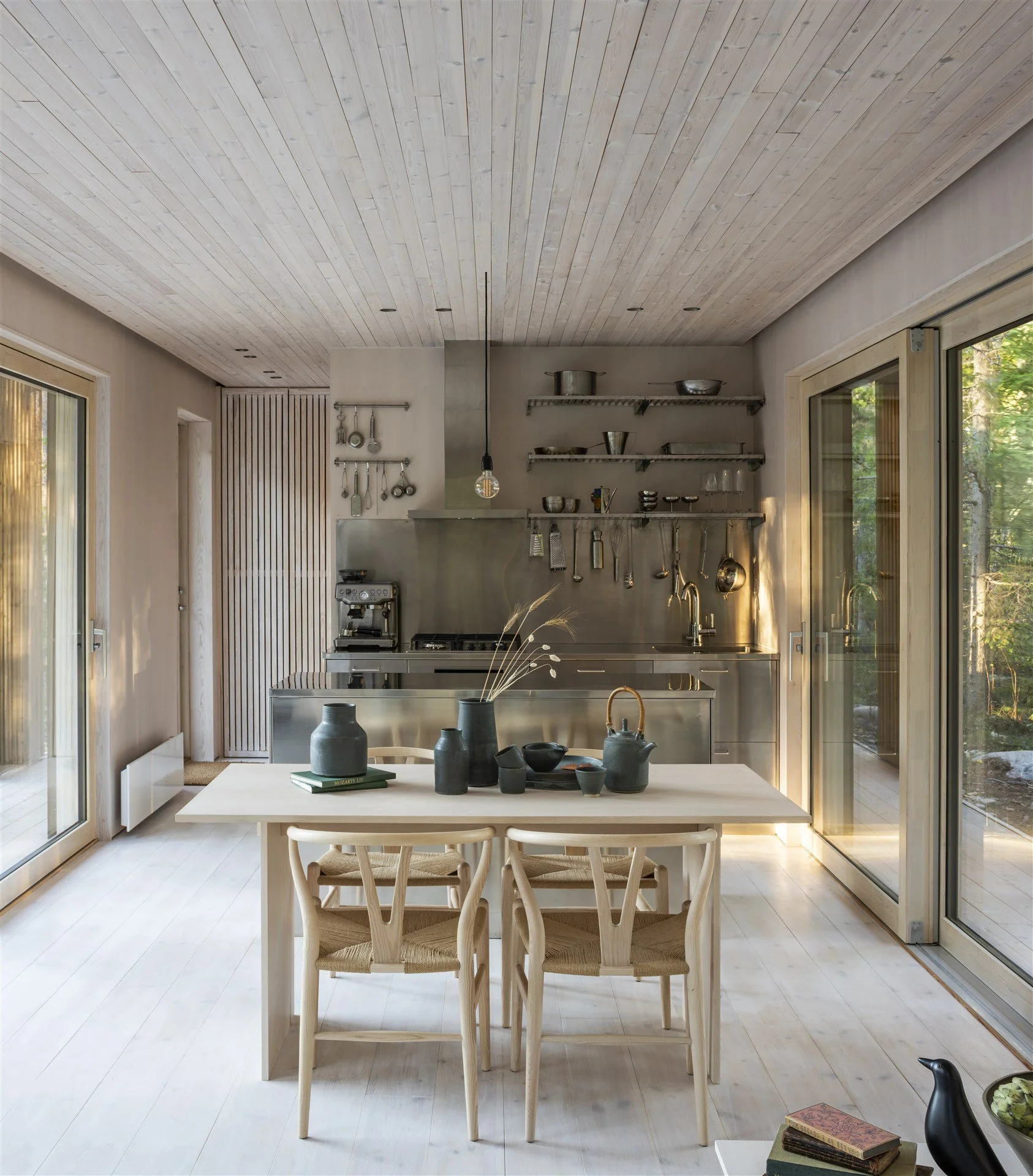 The house, which consists of two buildings under one roof, offers a hall, bathroom, kitchen and living room in one building and a lovely bedroom with large glass sections. and I really the exclusive and tasteful material choices. The kitchen and living room have beautiful light, solid wood floors, light birch veneer panels on the walls, large openable glass sections and a wood burning stove. Around the whole house runs a stunning covered terrace under a roof with a large lounge area between the buildings on a forest plot of 2,113 sqm by the Åland Sea. An amazing and real minimalist dream home if you ask me. You will find more about it here - Elvera